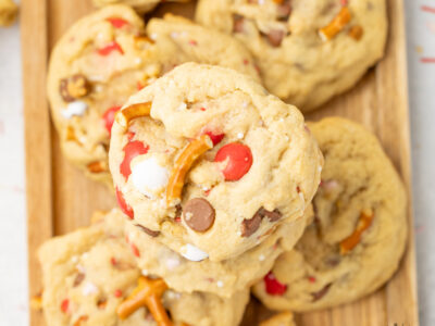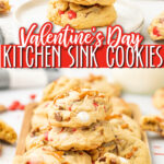 These Valentine’s Kitchen Sink Cookies are an easy, soft, and chewy cookie recipe packed with chocolate, pretzels, and festive Valentine’s mix-ins that everyone loves.