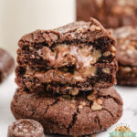 Make the cookie dough: Beat the softened butter with 1 cup of sugar and the brown sugar until creamy and well combined. Add the eggs and vanilla and mix again. In a separate bowl, whisk together the flour, cocoa, and baking soda, then gradually add to the butter mixture until just combined. Stir in ½ cup of the chopped pecans.